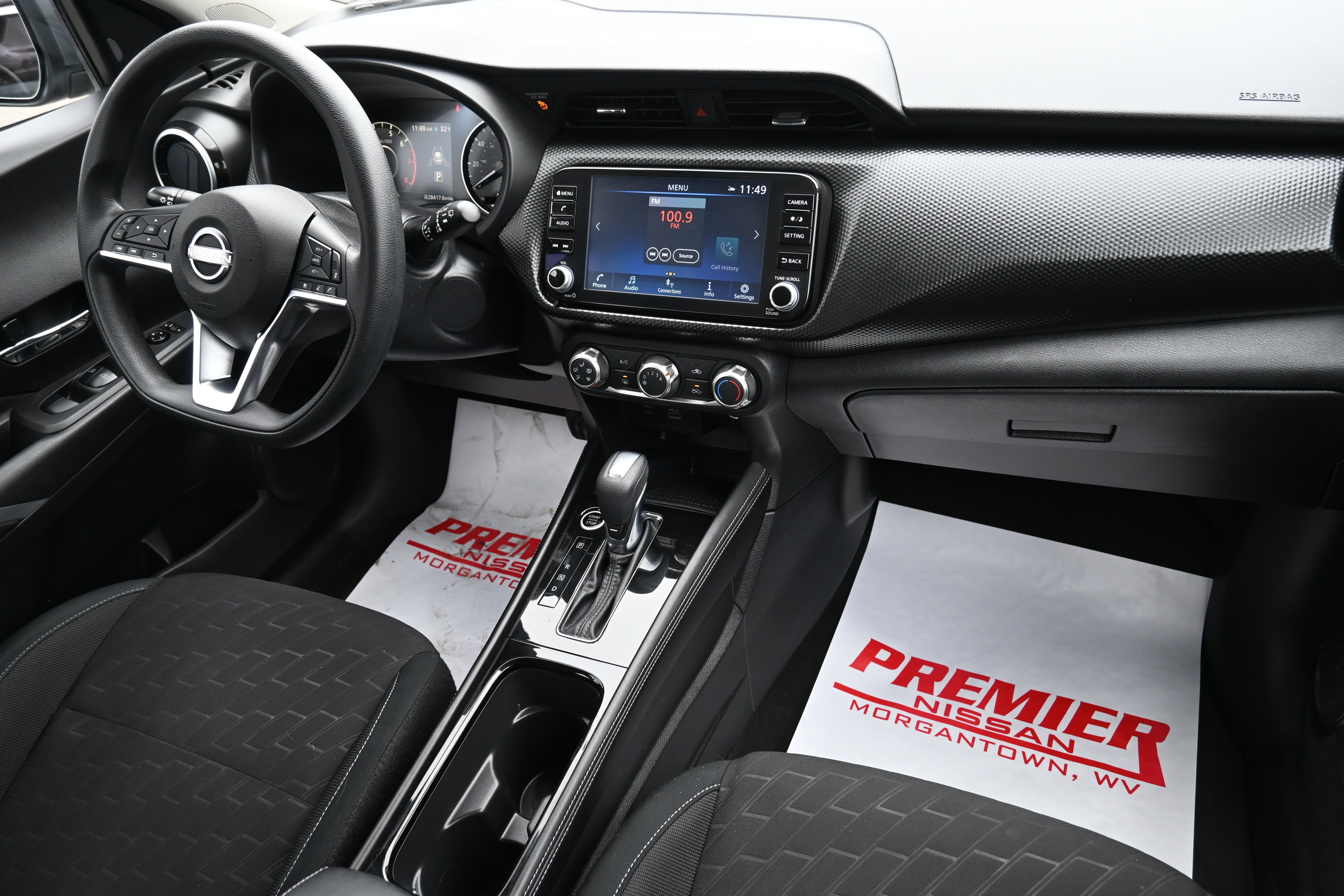 Nissan Certified Certified, 4-Wheel Disc Brakes, 6 Speakers, ABS brakes, Air Conditioning, Alloy wheels, AM/FM radio: SiriusXM, Apple CarPlay/Android Auto, Auto High-beam Headlights, Blind Spot Warning, Brake assist, Bumpers: body-color, Carpeted Floor Mats w/Cargo Mat, Cloth Seat Trim, Driver door bin, Driver vanity mirror, Dual front impact airbags, Dual front side impact airbags, Electronic Stability Control, Front anti-roll bar, Front Bucket Seats, Front Center Armrest, Front reading lights, Front wheel independent suspension, Fully automatic headlights, Heated door mirrors, Illuminated entry, Knee airbag, Low tire pressure warning, Occupant sensing airbag, Outside temperature display, Overhead airbag, Panic alarm, Passenger door bin, Passenger vanity mirror, Power door mirrors, Power steering, Power windows, Radio data system, Radio: AM/FM Audio System, Rear Parking Sensors, Rear reading lights, Rear side impact airbag, Rear window defroster, Rear window wiper, Remote keyless entry, Speed control, Splash Guards Grain (4 Piece), Split folding rear seat, Sport steering wheel, Steering wheel mounted audio controls, Tachometer, Telescoping steering wheel, Tilt steering wheel, Traction control, Trip computer, Variably intermittent wipers, and Wheels: 17" Alloy (5-Hole)